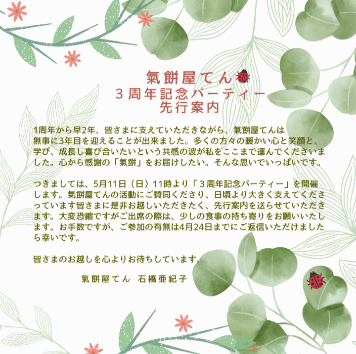 本日5月2日で、氣餠屋てんは3周年を迎えました。